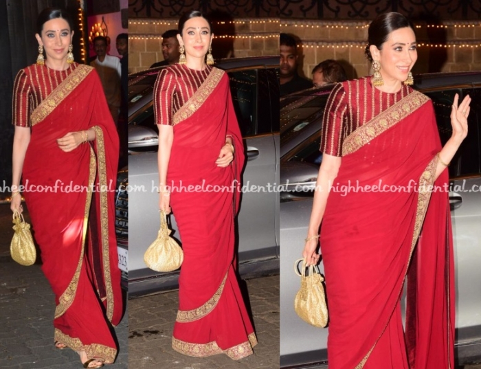 Karisma dropped by the Kapoor’s Diwali party on Sunday and was seen in a Sabyasachi sari. She looked absolutely lovely!