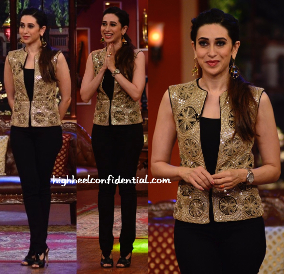 For her appearance on the sets of a television show, Karisma paired a Ritika Mirchandani vest with a black cami and pants. With her hair pulled back, she finished out the look with black sandals and Mrinalini Chandra earrings. Like her look?