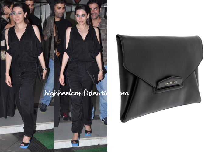 Sticking to black like she mostly does, Karisma opted for a jumpsuit at Sanjay Kapoor’s at home bash. The pop of color came via her shoes and eye-makeup versus her clutch, a Givenchy.