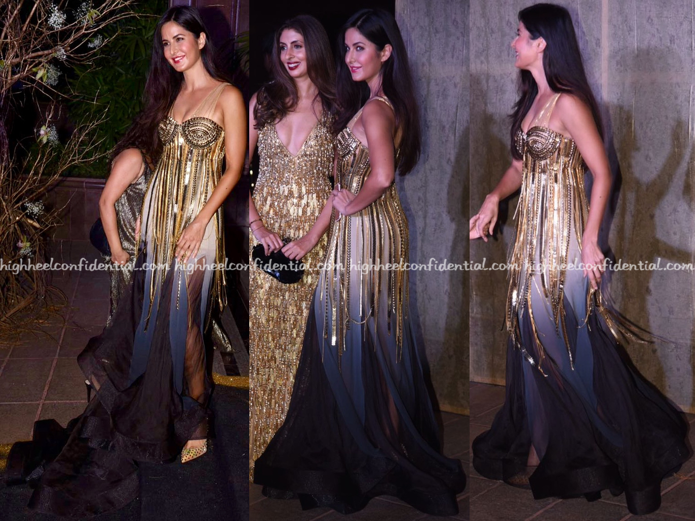 It was an embellished, semi-sheer Khosla Jani gown for Katrina while at a soirée earlier tonight. Wearing her hair down, she finished out the look with a red lip and pair of Louboutins.