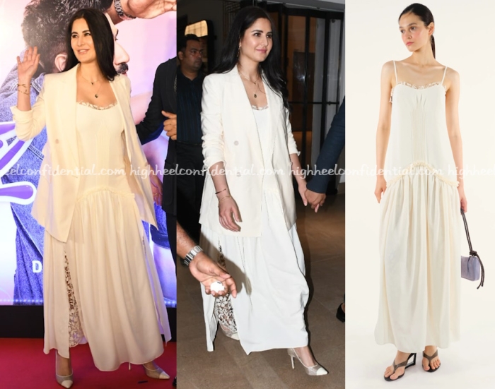 Katrina lent her support to Vicky at the screening of his movie and was seen in a maxi dress from SIEDRÉS paired with a blazer and Jimmy Choo pumps. That drop waist design wasn’t something I liked but Katrina made it work. She looked nice.