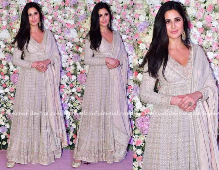 Katrina attended the Khan-Sharma Eid party on Saturday evening wearing a cream Tarun Tahiliani anarkali with juttis from Fizzy Goblet. She added color to the outfit via some pink eye-shadow but it didn’t seem to make as much of an impact. I found the look a bit one-toned but that’s me. She looked nice though.