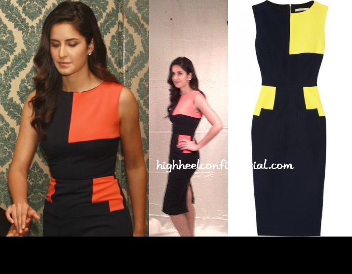 Katrina was in the capital with co-star SRK for the Hindustan Times Leadership Summit. For the event, she picked a color-block Victoria Beckham sheath dress.