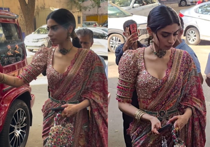At the mehndi party at her friend’s wedding, Khushi was seen in a multi-colored sari from Tarun Tahiliani. It is a busy sari but she looked nice in it. Catch a closeup of the puff blouse inside which was probably my only gripe with the sari. Am not a big fan of puff-sleeved blouses.