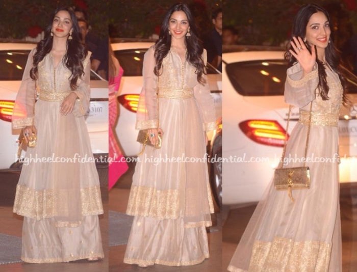 Kiara attended Ganesh Puja festivities at the Ambani household on Thursday evenign wearing a beige and gold sharara kurta set by Manish Malhotra with a gold Saint Laurent tassel bag.