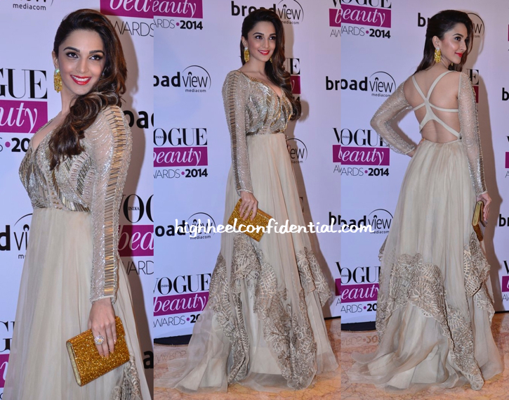 For the event last night, Kiara picked a Jade by Monica and Karishma gown. Gold-tone earrings, Jimmy Choo glitter clutch and side-swept hair finished out her look. The red lip seemed a bit harsh against the gown as did the earrings and clutch… A softer lip and more understated jewelry would’ve really helped elevate the look.