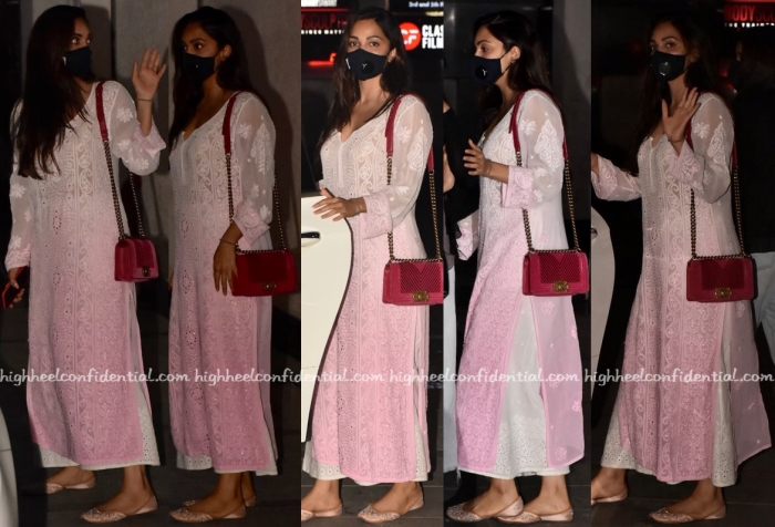 As she was exiting a filmmaker’s office in Mumbai, Kiara was photographed in a pink and white chikankari suit. Her accessories of choice included blush-toned jootis and a velvet Chanel ‘Boy’ bag. Was the look too matchy-matchy or just right?