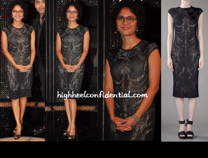 For her appearance on the Front Row, Kiran opted for a black lace dress by Alexander McQueen with criss-cross pumps. She looked great in the fitted dress but the innerwear/lining was distracting.