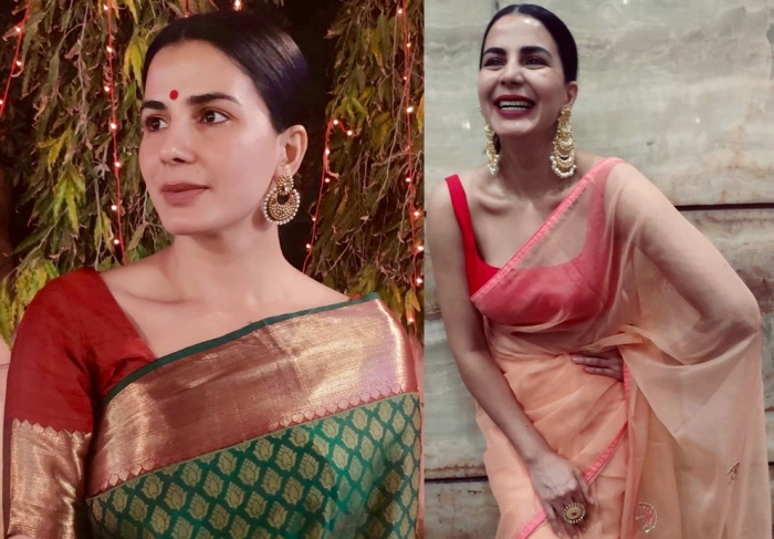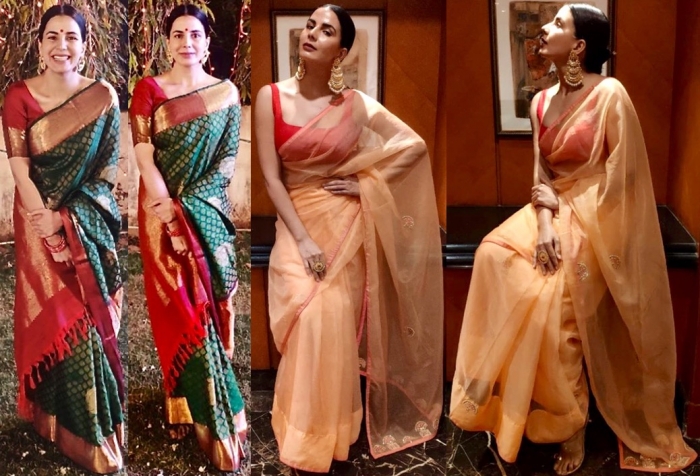 She looks great in both, but the green saree is fab and she looks gorgeous in it. Also, thankful for the ‘normal’ blouse with the green saree. Middle parted, severe hair with big earrings is a diktat for non-Sabya sarees as well ?