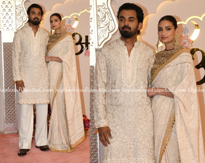 Rahul and Athiya co-ordinated in cream Abu Jani Sandeep Khosla outfits from their archival collection featuring chikankari work. They looked good!