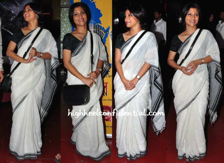 For the success meet of her Bengali film, Konkona picked a black and white cotton sari, wearing it with silver earrings, a classic wristwatch and a cross-body bag. She looked lovely!
