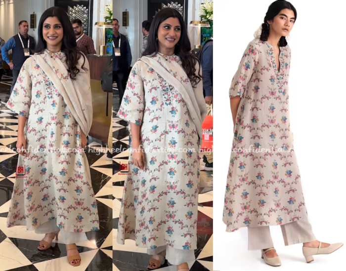 Konkona attended a panel session wearing a floral print kurta set from Anavila paired with a matching dupatta. She looked nice in it.
