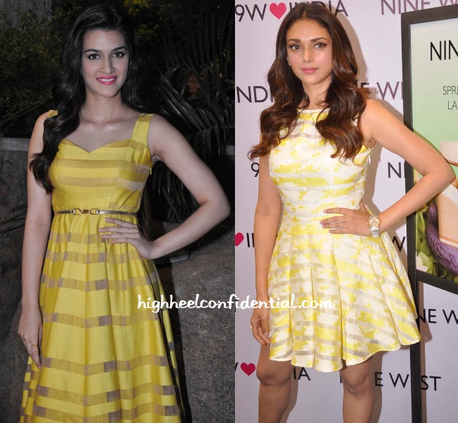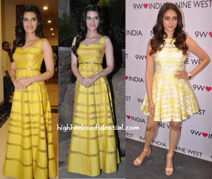 Kriti and Aditi may have worn yellow striped dresses to their respective events but that’s where the similarity ended. While Kriti wore a long maxi version cinched at the waist with a slim metallic belt, Aditi’s look was more simple finished out with nude sandals.