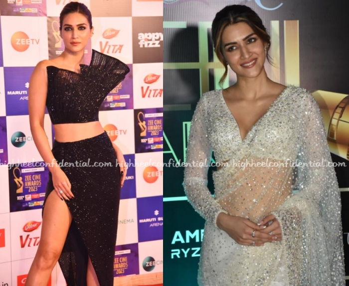 Back to back award events saw Ms. Sanon in sparkly outfits, first in a white sari from Seema Gujral and then in a structured top and skirt from Gaurav Gupta. Between the two, preferred her in the black here. The sari even with all its glitter just seemed so lacklustre.
