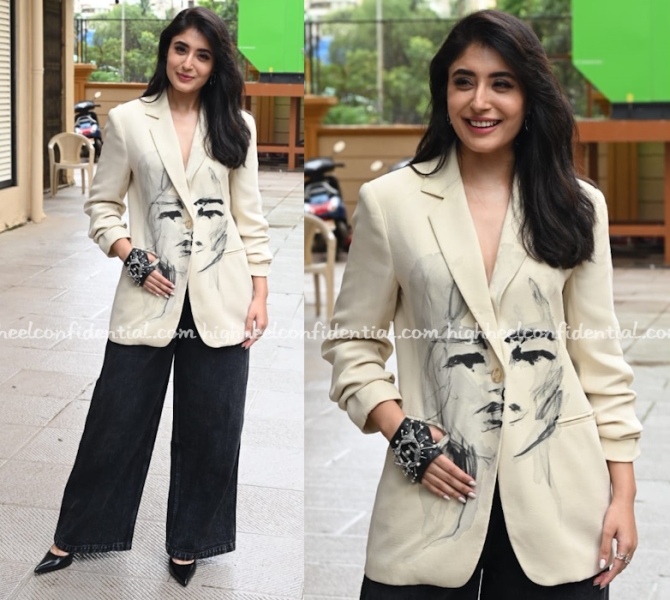 At promotions for her upcoming movie, Kritika was seen in a cream blazer featuring a face paired with black pants and an Outhouse leather embellished glove. She wore the blazer well but that Michael Jackson-ey glove looked very out of place.