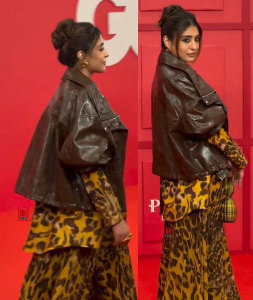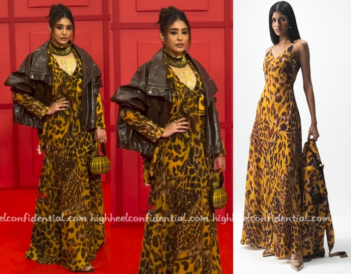 Kritika was seen at the GQ Men Of The Year event in a printed maxi and jacket set from Yam worn additional with a biker jacket and a yellow and black striped bag. The jacket over the blazer seemed like an odd choice but the blazer also seemed to vanish into the dress so didn’t look that bad.
