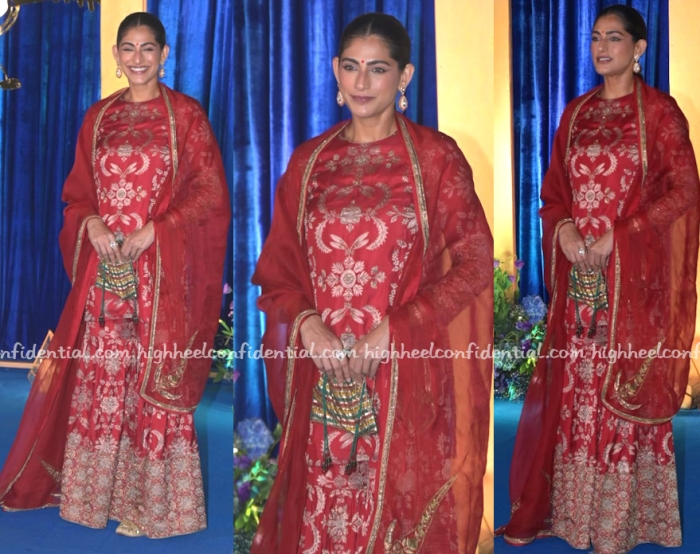 Kubbra wore a red brocade gharara from Raw Mango to a Diwali party on Saturday paired with polki style drop earrings and a striped potli. She looked lovely in it.