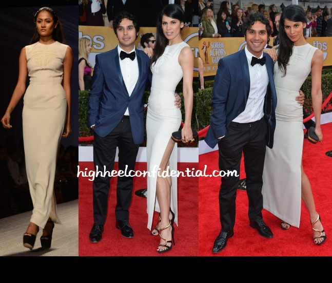 Neha accompanied hubby Kunal at the SAG Awards wearing a white Atsu gown. The gown featured light embroidery on the neck and a thigh high split which allowed for Neha to show off her leg and the gold Zanotti sandals. A black McQueen clutch finished off her look.