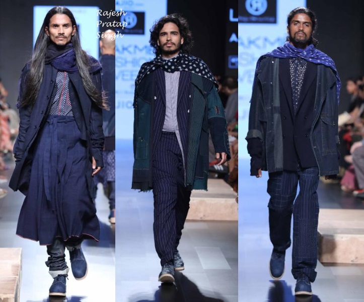 Rajesh Pratap Singh used yarn that was manufactured from recycled bottles and damaged garments for his line. He also showcased pre-owned clothes as a serious style option.