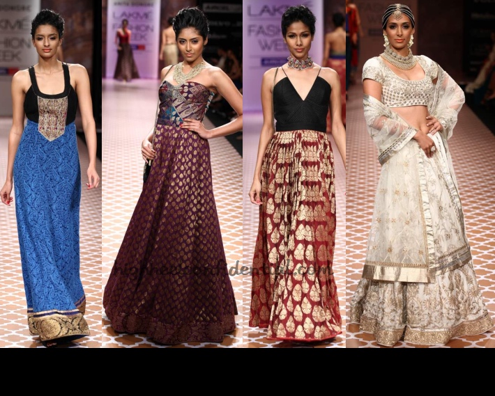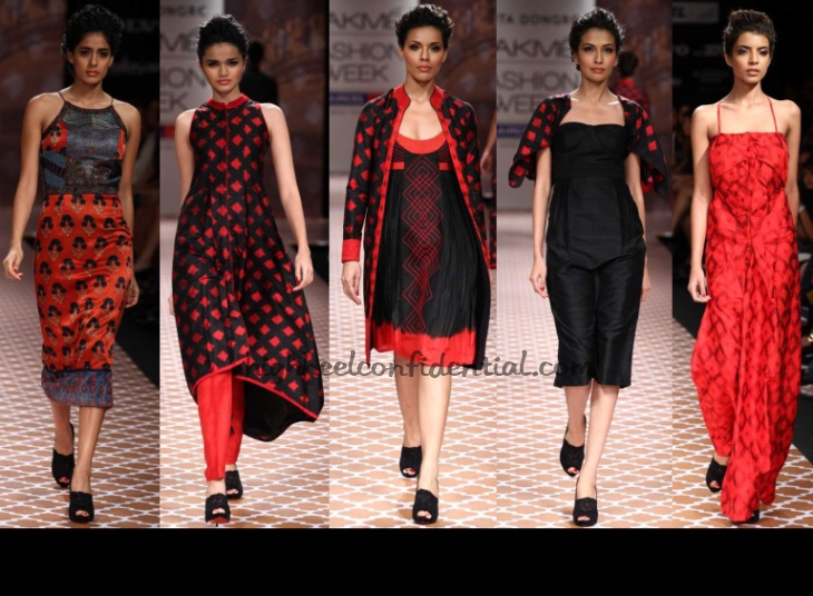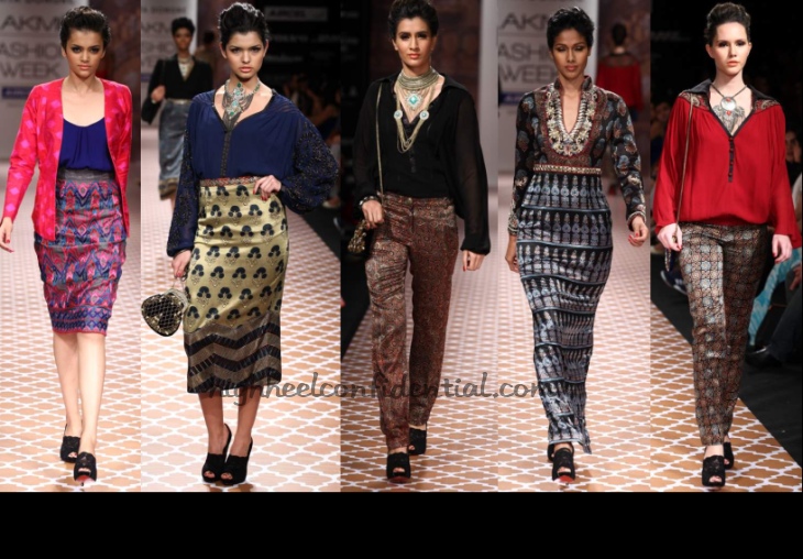 Anita Dongre closed out day three of LFW with a collection titled “Urban Goddess” consisting of indo-western silhouettes using traditional weaves and ikat prints. While her Resort collection had more flared dress, this collection was more into a fitted look with pencil skirts and cigarette pants with the occasional maxis that have become a trademark. We’re sure to see the collection off the runway soon. It’s just a question of when.