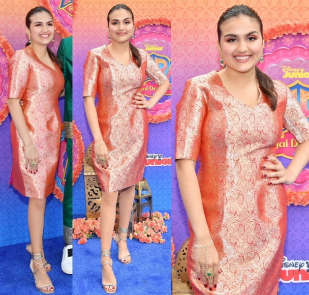 Leela attended the premiere of Mira, Royal Detective on Friday evening wearing a red brocade dress with silver ankle-strap sandals, kundan earrings and a kundan haathphool. Loved that she kept it simple. She looked nice.