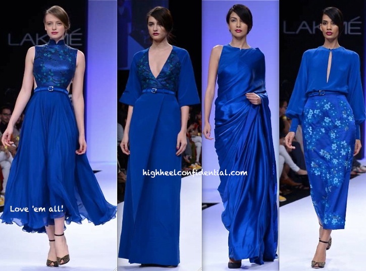 Lovely collection – particularly love the electric blue kimono style gown in the top row. But anyone get a touch of Elie Saab from it all? Especially with those thin belts at the waist…