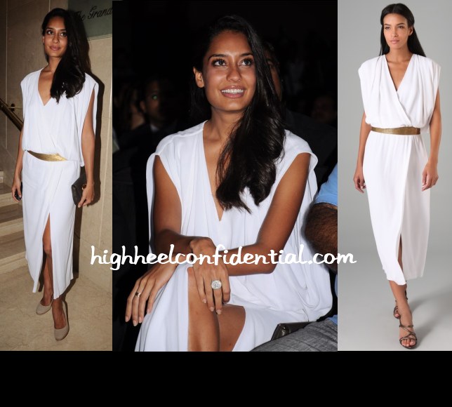 At the music launch of her second movie, model Lisa kept it simple in a DvF wrap maxi dress paired with grey suede Louboutins.