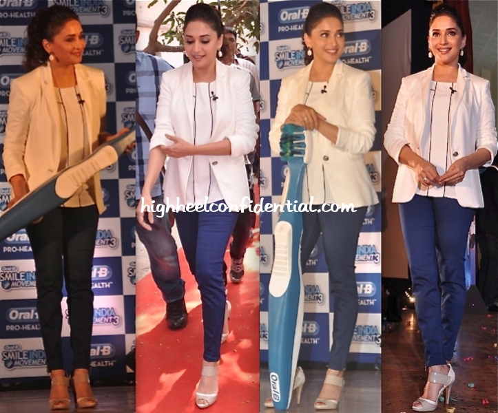 Wearing colors of the brand she was promoting, Madhuri put in an appearance in blue pants, a white top and blazer and some neutral sandals. A ponytail and drop earrings finished out her look.