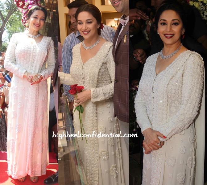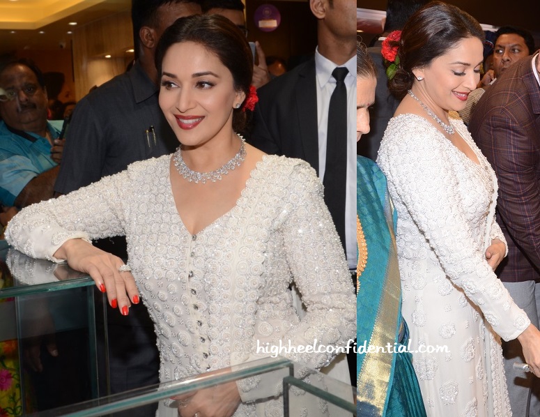 The launch of a jewellery store on Saturday saw Ms. Dixit in a white Abu Jani Sandeep Khosla suit. Paired with diamond jewellery from her collaboration “Timeless By Madhuri” collection for the brand, Madhuri’s look was finished out with roses in her hair.