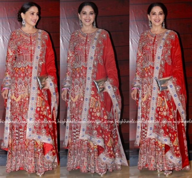 While at a birthday do last evening, Madhuri was photographed in an Anamika Khanna suit. Wearing her hair up, she rounded out the look with silver jewelry and clutch, and pair of metallic sandals. It’s an intricate suit with a lot to take in but Madhuri made it all work; she looked lovely.