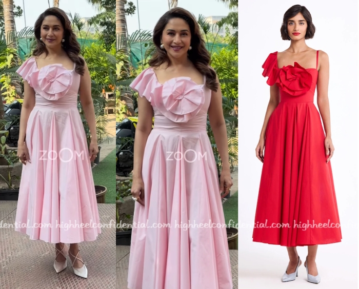 Madhuri attended promotions for her series wearing a pink dress from Gauri and Nainika and while I don’t like the rosette in the middle of the bust, she looked nice in it, nevertheless.