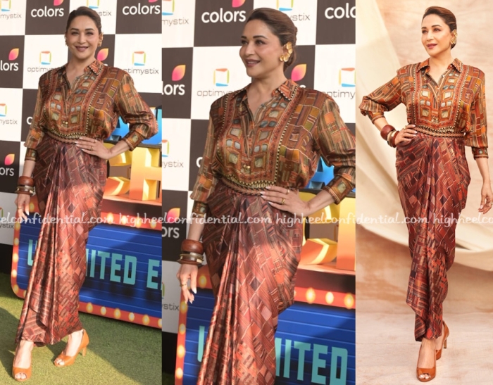 Madhuri attended promotions for her series last week wearing a draped printed dress from OTT By Tarun Tahiliani. A stack of wood bangles, gold ear cuffs and brown shoes finished out her look. Yes, it was a whole lotta busy print but I really liked this one on her.