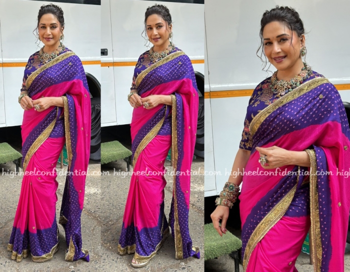 Madhuri taped for an episode of Dance Deewane on Saturday wearing a Raw Mango sari. This particular sari ain’t my cup of tea but I’ll take all the jewellery! 😛