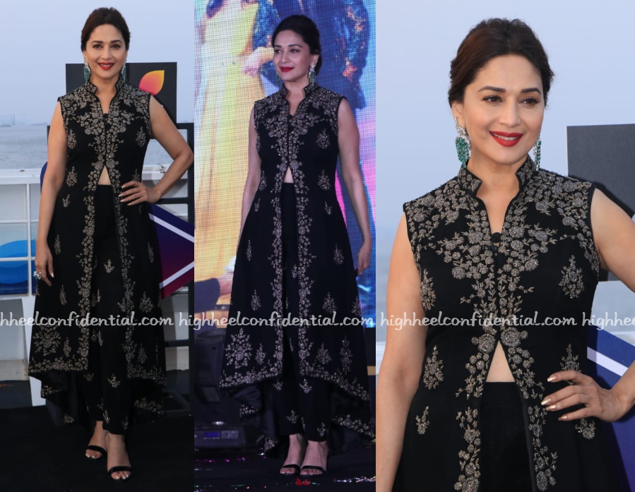 At the press meet to announce another season of Dance Deewane, Madhuri was seen in separates from Sawan Gandhi paired with ankle-strap sandals and emerald earrings. Liked the outfit but the earrings pairing, not so much. You?