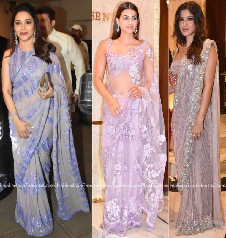 Wearing lilac-toned saris by Manish Malhotra, these lovely ladies attended the Diwali do at his house. Who had your favorite look?