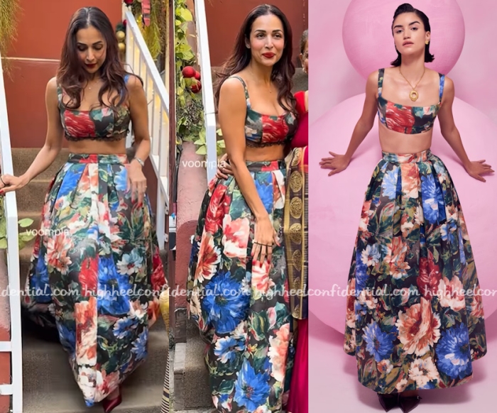 Malaika was spotted on Saturday grabbing lunch with her family wearing a floral print crop top and skirt from July Issue paired with pumps. Her top was modified from the original version to have a lace trim and while I don’t mind the top itself, just not a fan of that box pleat skirt. But that’s just me. (I probably still have trauma from wearing ill-flattering box pleat pinafore! :P)