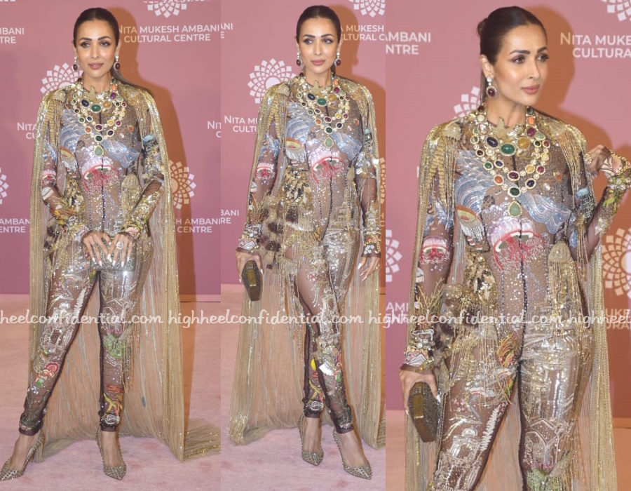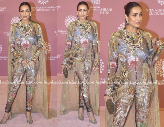 At the unveiling of the India In Fashion exhibit and gala at NMACC, Malaika was seen in a Rahul Mishra jumpsuit from his Couture collection. The cape seems like an addition after seeing the runway version (See inside) and I don’t mind it. What I do mind is that necklace and that the stitching ran across the middle. I know this event is going to make everyone go the maximalist route but I didn’t think the necklace went with the jumpsuit. Other than that, she looked good.