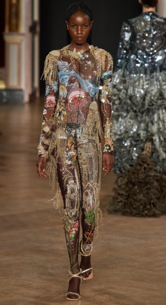 This creation is goo don the runway or a magazine cover! It is not practical at all to wear at a social gathering! Totally agree with the black line running the ensemble. The cape was probably added to avoid it being too bare for the body from the back. I wish she had chosen something else!