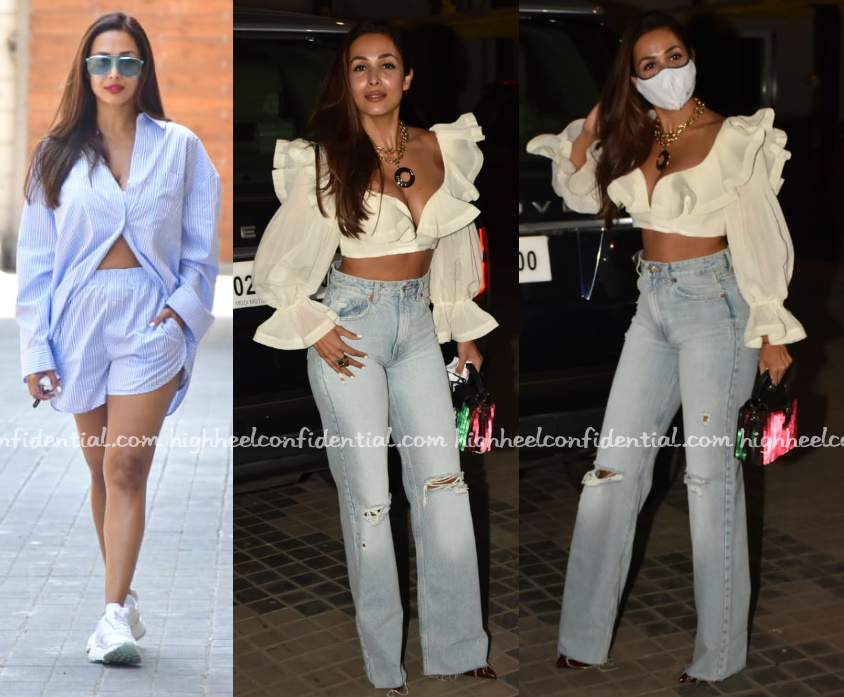 Malaika was spotted on Saturday sporting a striped short and shirts set in the daytime and then a Zimmermann ruffle top with denims at night at a party. She sure looked comfy in the shorts. As for the denims look, the denims were just the wrong pick here. Didn’t go with that top one bit.