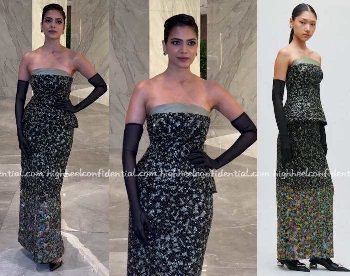 Malavika attended a dinner hosted by a magazine and was seen wearing a strapless top and skirt set from Chorus (previously known as Moonray). Like the model she also wore the gloves with the set and finished out the look with an updo. She looked good in it.