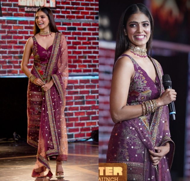 At the audio launch of her movie, Malavika was seen wearing a maroon embroidered Sabyasachi suit with jewellery from Jaipur Gems. She looked lovely.