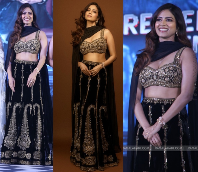 Malavika attended pre-release event of her upcoming movie wearing a black embroidered lehenga from Torani. With that choli and skirt being so ornate, it was a good move to keep the jewels simple. She looked nice.