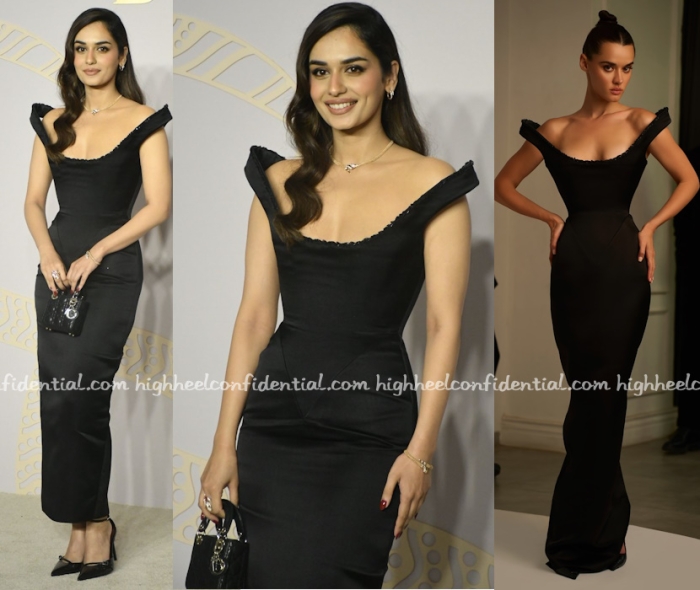 Manushi was the third person at the event to wear a dress that had an off-shoulder neckline. Her Surya Sarkar was modified to be an ankle-length dress vs a gown and I thought that was a great modification. Black pumps and a mini Lady Dior finished out her look. She looked good!