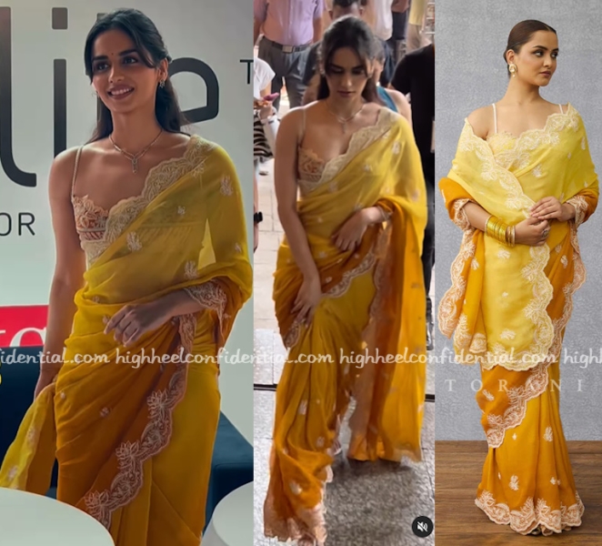 It’s a lovely sare but i felt if the highlight was jewellery, then this outfit was misplaced because it wouldn’t let the jewellery shine . Same is the cake with her hair , wish it was in a fun so that focus is on jewellery . I though Samantha ‘s stylist had done an impeccable job with the cobalt blue outfit for jewellery preview