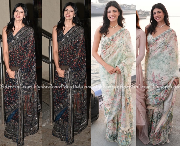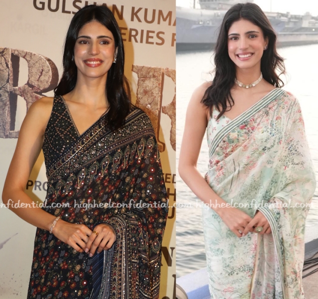Medha attended promotions and the screening of her movie wearing printed embellished saris from Anita Dongre, first in a white one and then in a black one. She looked lovely in both.