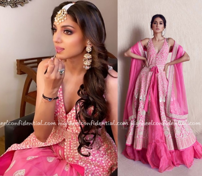 The Dagubatti-Bajaj pre-wedding festivities have begun and at her haldi ceremony, the bride to be was spotted wearing an Arpita Mehta lehenga with cowrie shell jewellery. She also wore another pink outfit by Arpita for her mehendi, although we don’t have a full length at this time.