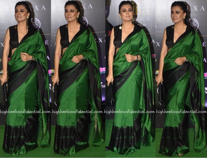 Wearing a lovely green and black silk sari, Mini attended an awards event last evening in Mumbai. With her hair pulled back in to a ponytail, she rounded out her look with gold-toned earrings and a black clutch.