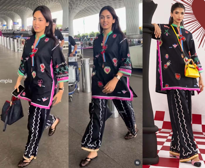 Mira travelled out of Mumbai Sunday wearing a black printed kurta set from Sana Safinaz paired with jelly mules and an LV bucket bag. Like the set?