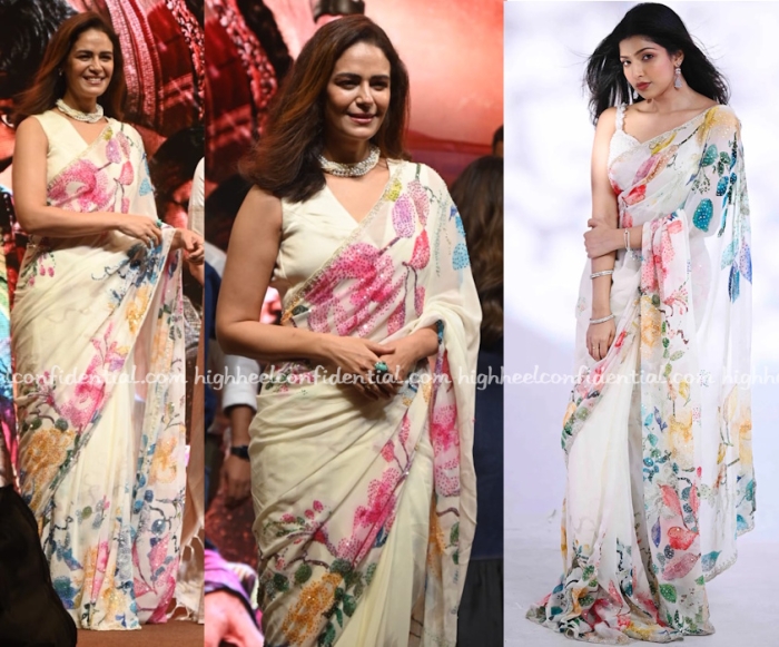 Mona was seen at the trailer launch of her upcoming series in a floral print sari from Samyakk paired with a multi-strand pearl necklace and v-neck sleeveless blouse. She looked lovely in it.