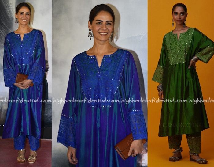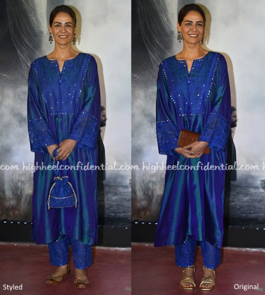 Mona attended a screening on Monday evening wearing a blue choga set from Heena Kochhar and as delish as the choga was, the gold strappy sandals and the brown clutch made for not so great finishing touches and distracted from the set.